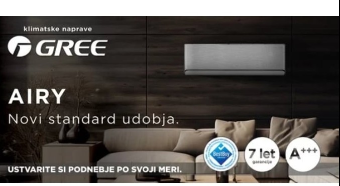 Klimatska naprava Airy je odlična izbira za vse, ki želijo kakovostno in učinkovito hlajenje ali ogrevanje prostorov. Sodi v energijski razred A+++ in s svojo zmogljivostjo v ekstremnih pogojih deluje pri zunanji temperaturi do -25 °C in ima 90 % nazivne moči pri – 10 °C. Hibridno odtajanje HDT zagotavlja varno in stabilno delovanje sistema tudi pri -10 °C in je skrajšano na 2-3 minute. Podjetje Gree je razvilo inovativno tehnologijo G-AI, ki z algoritmom umetne inteligence prepoznava potrebe uporabnika in izbira parametre delovanja naprave na način, ki zagotavlja popolno udobje ob varčevanju z energijo ter s tem prispeva k znižanju letne porabe energije kar do 20 %. Generator ionov in UVC sterilizacija ponujata najboljše pogoje za vedno čist zrak. Uniči lahko bakterije propagule, mikobakterije, viruse, glive in zmanjša rast mikroorganizmov na uparjalniku, zaradi česar je vsak vaš vdih zdrav in čist. Stopnja sterilizacije stafilokoknih bakterij pa je kar 93,9 %. Nova klimatska naprava Airy bo tako s številnimi naprednimi funkcijami vsak dan poskrbela za udobje in dobro počutje v vašem domu ali pisarni.