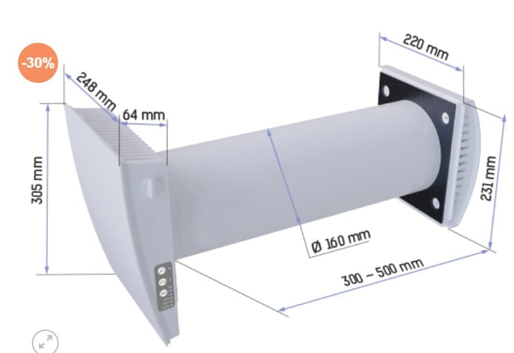 Možna montaža v pripravljeno luknjo (od ∅170 mm) v steni.Nadzor vlažnosti s senzorjem vlage.
