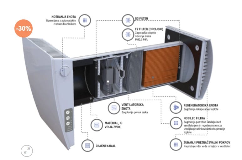 • Učinkovitost rekuperacije toplote ≤ 90%